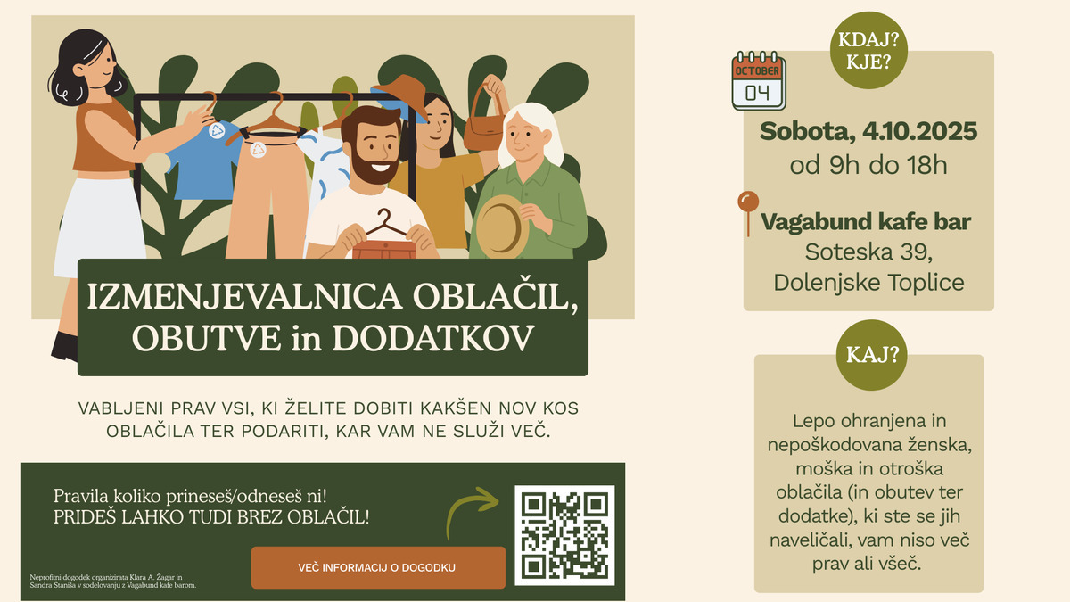 V soboto, 4. oktobra 2025, bo v Vagabund Kafe Baru v Soteski potekala jesenska izmenjevalnica oblačil. Dogodek bo trajal od 9.00 do 18.00, namenjen pa je vsem, ki želijo obogatiti svojo garderobo ali dom z zanimivimi predmeti ter obenem podariti stvari, ki jih sami ne potrebujejo več.