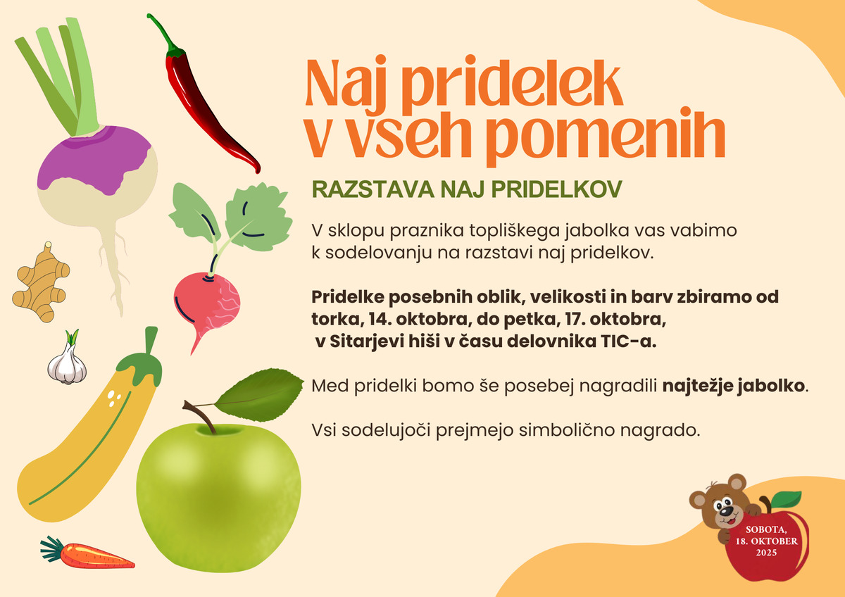 Potem je to vabilo za vas! Vljudno vas vabimo, da svoje "naj pridelke" prinesete in jih delite z nami in celotno občino na posebni razstavi v okviru Praznika topliškega jabolka. Pridelke zbiramo od torka, 14. oktobra, do petka, 17. oktobra, v delovnem času TIC Dolenjske Toplice v Sitarjevi hiši.