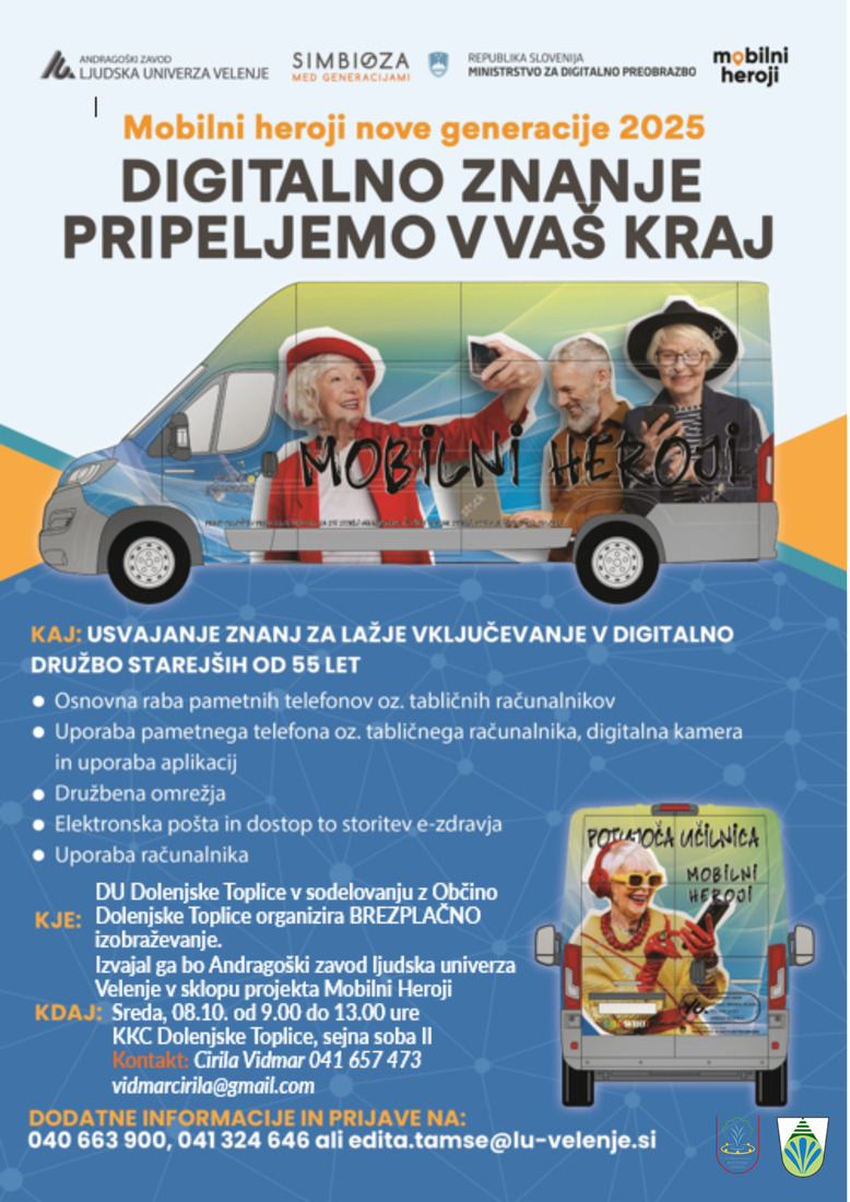 Društvo upokojencev Dolenjske Toplice in Občina Dolenjske Toplice vabita na izobraževanje z naslovom Mobilni heroji, ki bo potekalo v sredo, 8. oktobra, med 9. in 13. uro v sejni sobi II, KKC Dolenjske Toplice.