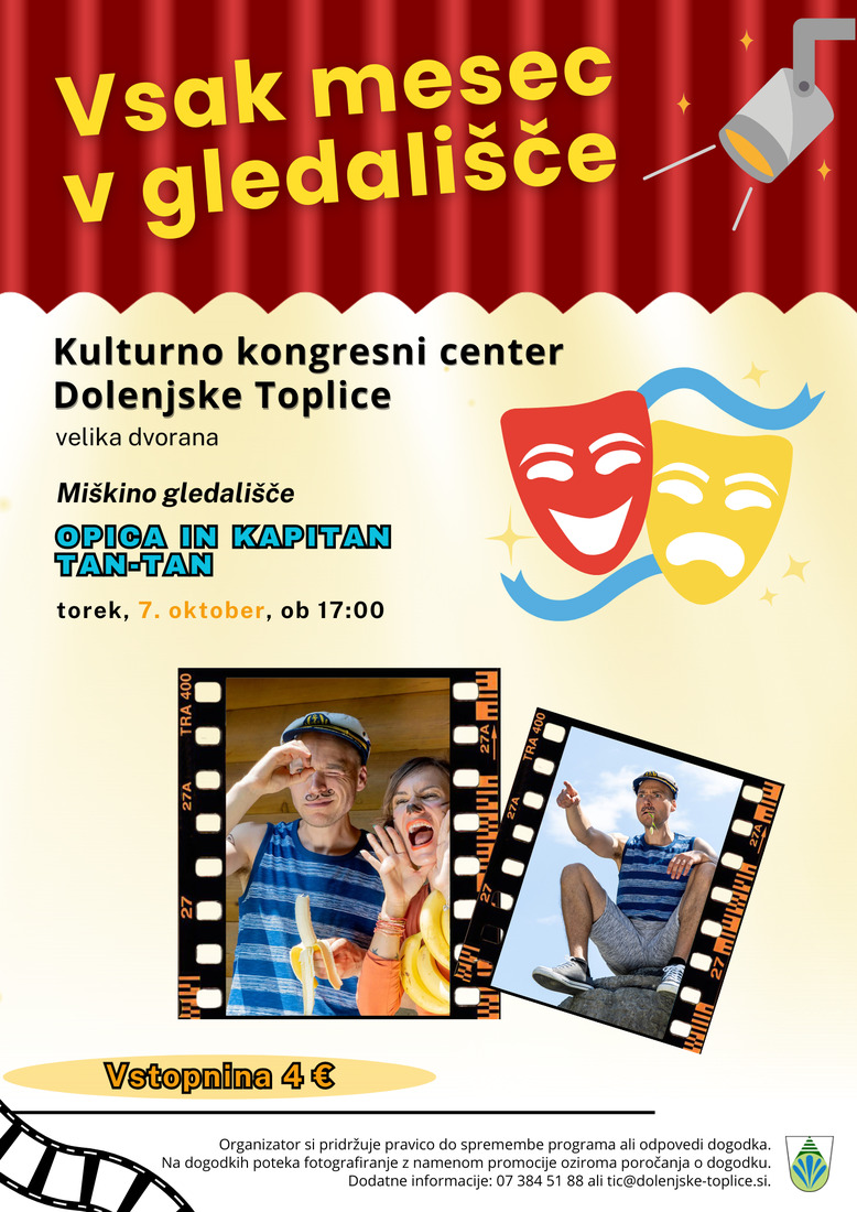 Vabljeni na predstavo za otroke z naslovom Opica in kapitan Tan - Tan, ki bo 7. oktobra ob 17. uri v veliki dvorani KKC Dolenjske Toplice.